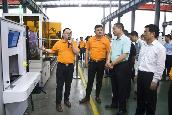 在參觀車間的過程中,嘉泰數(shù)控董事長蘇亞帥向辛國斌副部長一行介紹了公司的發(fā)展方向、產(chǎn)品技術、自主研發(fā)能力及產(chǎn)品的應用領域和發(fā)展現(xiàn)狀,詳細匯報了公司近年來加快向“智能一代”邁進、加快創(chuàng)新技術研發(fā)、深化產(chǎn)學研合作、積極承擔數(shù)控一代龍頭企業(yè)責任、深入推進“互聯(lián)網(wǎng)”和“智能制造”方面的新舉措。聽了蘇董的介紹,辛國斌副部長勉勵嘉泰數(shù)控多對標國際先進技術,借鑒成功經(jīng)驗,增加核心競爭力,培育更多有自主知識產(chǎn)權和市場競爭力的產(chǎn)品,探索工業(yè)發(fā)展創(chuàng)新模式,把推進智能制造作為培育工業(yè)增長的新動力及提高生產(chǎn)效率和提升質(zhì)量的重要舉措,努力實現(xiàn)彎道超車。 智能制造示范車間里,擁有自適應能力的智能機器人、智能檢測設備以及成熟運用的數(shù)字化工廠平臺系統(tǒng)吸引了辛國斌副部長一行。他詳細詢問各個環(huán)節(jié)的技術關鍵點,給出指導意見,并鼓勵嘉泰數(shù)控要堅持自主研發(fā),繼續(xù)創(chuàng)造中國style。辛國斌副部長還仔細了解了嘉泰數(shù)控采用超聲波輔助加工及多種智能傳感器結合的新產(chǎn)品——超聲波加工中心,并與嘉泰數(shù)控相關項目的技術專家探討該設備針對特種材料加工的技術問題,且當場提出很多寶貴的指導意見。 國家工信部副部長辛國斌與嘉泰數(shù)控相關項目的技術專家探討關于特種材料加工的技術問題