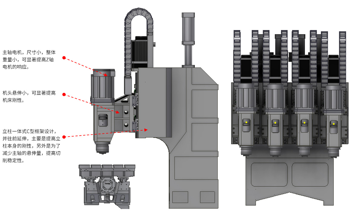該系列產(chǎn)品主要針對2.5D、3D玻璃、的大面開粗加工,以及外輪廓加工,4個切削主軸設(shè)計,多通道可單獨控制主軸升降,并采用直聯(lián)機械主軸設(shè)計,主軸切削扭矩大,對于玻璃等脆硬材料的粗加工有很大優(yōu)勢。